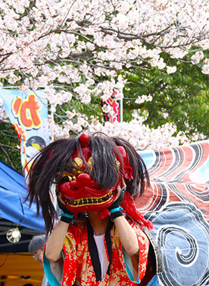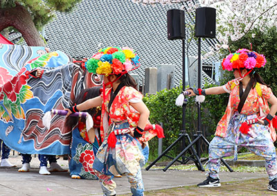 桜がほぼ満開のもと、地元の獅子舞が披露されました。