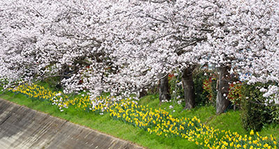 側を流れる千条川の桜並木。