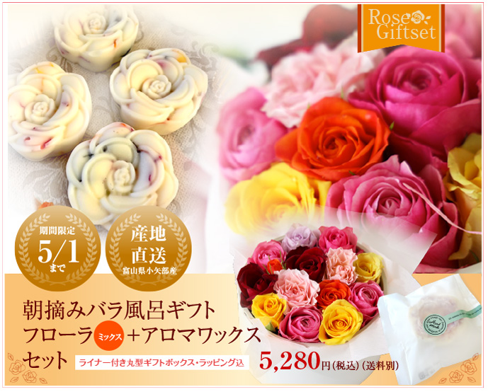 【期間限定・母の日におすすめ】朝摘みバラ風呂ギフト フローラ(ミックス)とアロマワックスセット【生花】【数量限定】【ローズバス・フラワーギフト・母の日・花の日・結婚祝・誕生日・記念日・特別な日・歓送迎会・プレミアムな贈り物に】