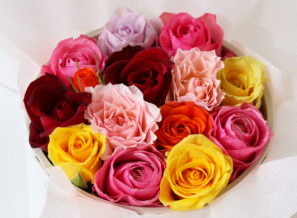 上品なグレーミスト色の丸い箱を開けると色鮮やかな本物のバラが。