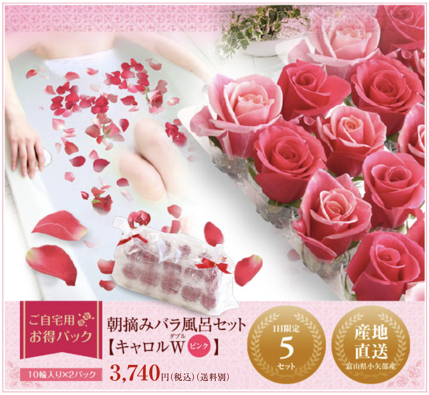 自然豊かな富山県小矢部産朝摘みの美しい生花のバラは、お風呂にそっと浮かべるだけでロマンティックなバスタイムを演出してくれます♪