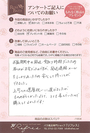 先 日は二回のバラの発送をありがとうございました。 一回目はお礼で義姉に、今回は普段お世話になっている叔母宅へのお土産でしたので、私が到着する前に配送してもらうようにお願いさせてもらいました。クー ル便でバラを受け取っていた叔母はとても喜んで見せてくれました。バラはわずかに開きかかっていてとてもステキで、叔母はうっとり眺めていました。わたし (送り主)は、思ったよりも箱が小さかったな・・・こんなに喜んでくれるならやっぱり二箱分送りたかったな、という印象でした。一人に同じものを二箱は送りにくいので、二箱分のサイズの大きいものがあるといいと思います。このバラ風呂は目上の方への贈り物としてもとても素敵な商品だと思います。また利用させていただきたいと思いますので、その際はどうぞよろしくお願いします。