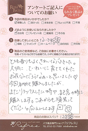 薔薇風呂セット購入。 発送からアフターフォローまで、心のこもった対応をしていただけました。PC越しですが、直接顔を合わせているような親近感を感じました。プレゼントのお相手も大変喜んでおりました。感謝します。